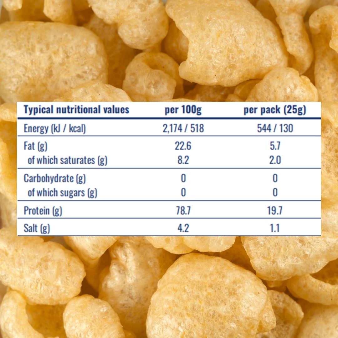 The Spanish-style chicharrónes are our take on the classic English scratchings and crackling, just lighter, crunchier and loaded with way more protein. Naturally carb-free, our pork rinds are a healthier snack alternative to potato crisps, crackers, or popcorn. You can also enjoy this uplifting snack as an appetiser or side dish, or crumbled on top of anything that needs a crunchy flavour boost!